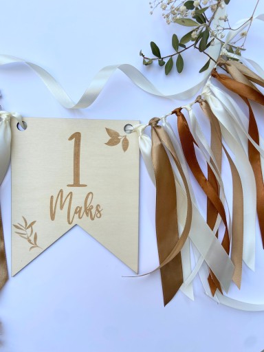 Girlanda na krzesełko z drewnianym proporczykiem z dowolną cyferką i imieniem. Wykonana ze sklejki drewnianej z wzorem listków i wstążkami w beżowo brązowych kolorach. Dowolna cyfra i imię do wybrania.