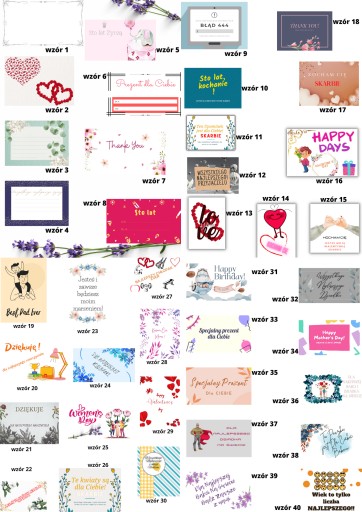 - *1-8 ( w wiadomości należy podać, który nr bileciku dołączyć, dodatkowo możemy spersonalizować dowolną treścią tekstu np. (bilecik nr.1 "Dla Najlepszego przyjaciela od Adama")