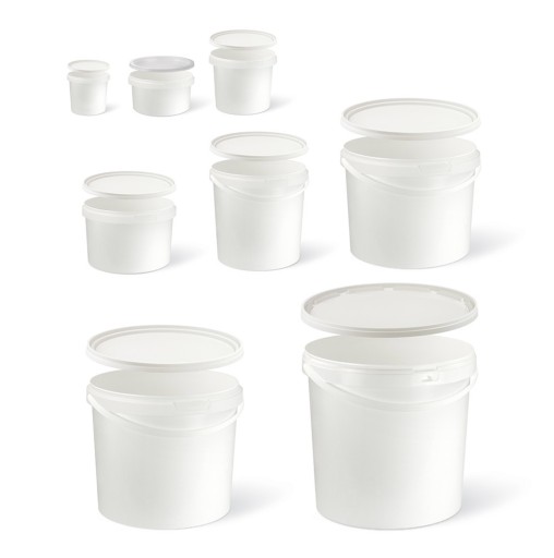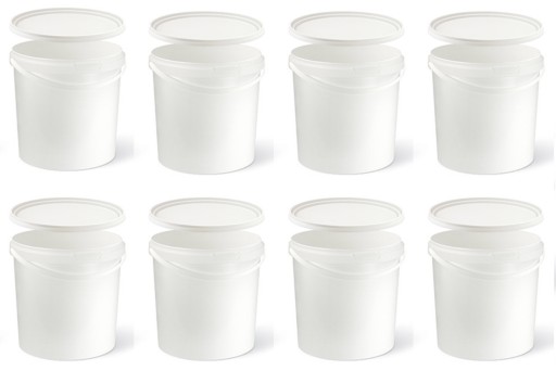 Praktyczne pojemniki plastikowe z przykrywką do mieszania i przechowywania farb i lakierów.