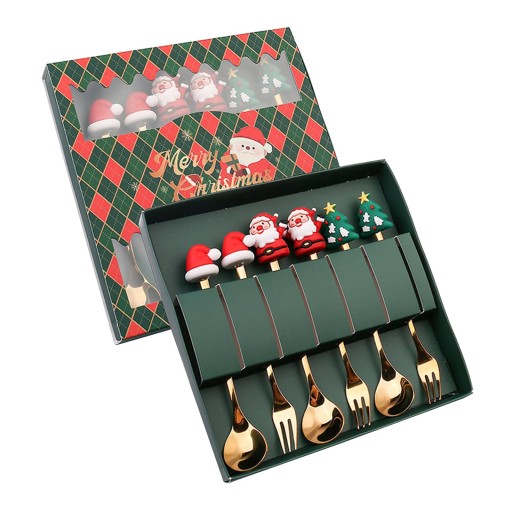 [Kreatywny projekt]: Zestaw 6 świątecznych łyżek i widelców ozdobionych jest dekoracjami o tematyce bożonarodzeniowej, w tym Mikołajem, choinką i łosiem.