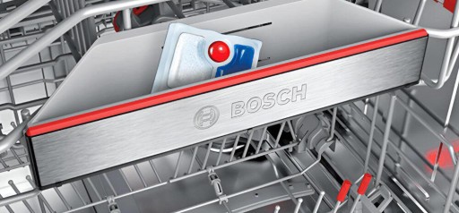 Szuflada BOSCH Vario3 ma nie tylko oddzielną przegródkę na każdy nóż, widelec i łyżkę, ale dzięki dwóm składanym czerwonym elementom pomieści także większe łyżki do zupy, szpatułki, małe filiżanki i pojemniki. Dzięki temu pozostaje więcej miejsca na pozostałe półki.