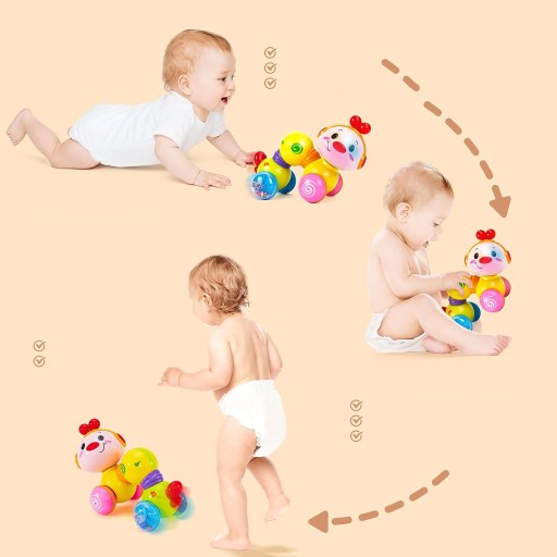 🎈【Wszechstronna zabawka do raczkowania dla dzieci od 6 miesięcy】Głowa może się obracać i jednocześnie wydawać dźwięki, które rozjaśniają dziecko, aby zidentyfikować dźwięk. Na przednim kole znajduje się graficzna konstrukcja krętlika, która tworzy wrażenie dynamicznego obrotu podczas poruszania się do przodu, co poprawia wrażliwość wzroku dziecka. Ponadto kolorowe perły odbijają się w tylnym kole i wydają szum hałasu, co budzi zainteresowanie dziecka raczkowaniem.