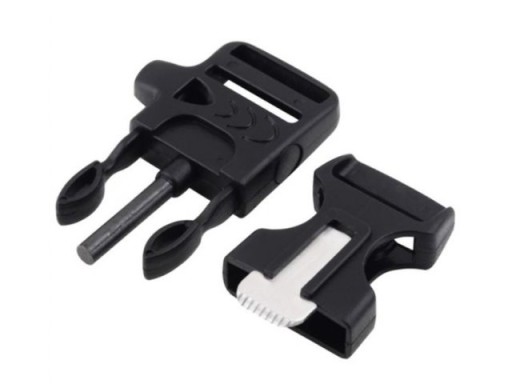 Wykonana z wytrzymałego tworzywa klamra zawiera w sobie nóż, gwizdek oraz krzesiwo z magnesium. W prosty i szybki sposób pozwala na założenie oraz zdjęcia całego gadżetu i natychmiastowe skorzystanie z poszczególnych rozwiązań. Ząbkowany mini nóż z łatwością przetnie wiele rodzajów materiałów, a jego stabilne osadzenie w klamrze ułatwia posługiwanie się nim.