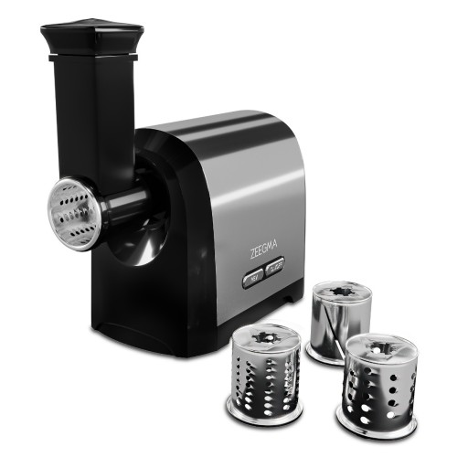 Maszynka do mięsa marki Zeegma wyposażona w 3 dyski tnące o zróżnicowanej wielkości oczek, dzięki którym można nie tylko mielić mieso czy twaróg, ale również siekać warzywa i orzechy