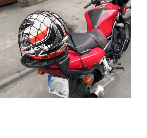 Uniwersalna siatka bagażowa, doskonale unieruchomi kask lub inne przewożone rzeczy na motocyklach, quadach i innych pojazdach.