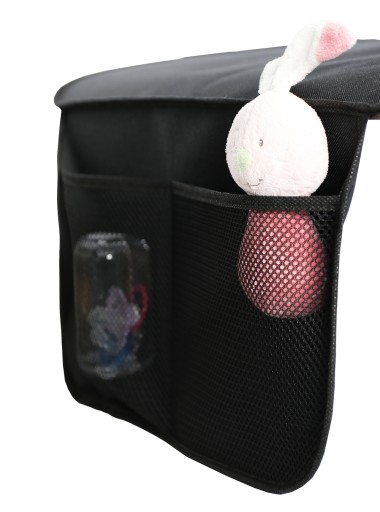 Siedzisko jest dodatkowo podszyte gęstym poliestrem, który stanowi warstwę wodoodporną. Mata ochronna jest łatwa w montażu – wystarczy rozłożyć ją na siedzeniu i zamocować do zagłówka za pomocą elastycznej tasiemki przyszytej w górnej części oparcia. Dwie kieszenie znajdujące w dolnej części maty pozwolą na przechowywanie niezbędnych rzeczy.