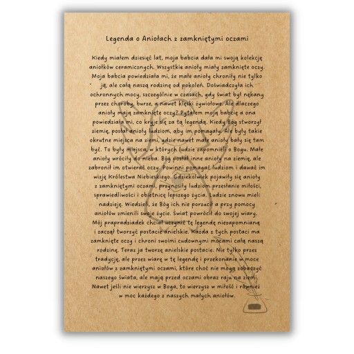 Do każdego aniołka dołączona jest przepiękna legenda o aniołach z zamkniętymi oczami.