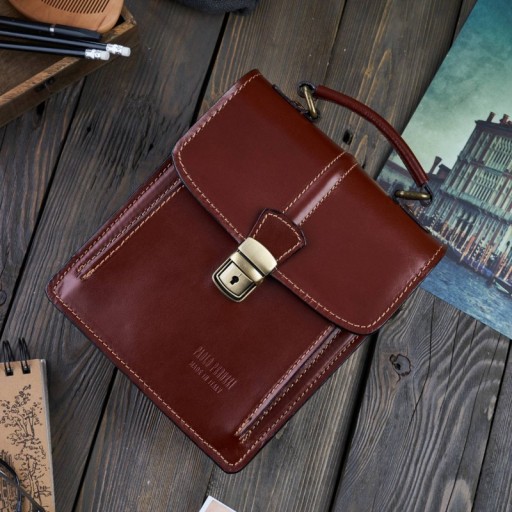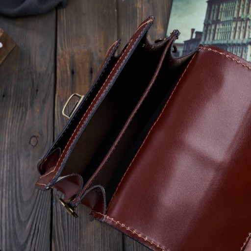 Kuferek wykonano we Włoszech, z wysokogatunkowej skóry licowej. Zapinany klamrą typu tic-tac, posiada opcję zamykania na kluczyk. Pojemne wnętrze kuferka składa się z komory głównej, dzielonej na dwie przegrody. Dodatkowo, do dyspozycji jest jeszcze frontowa kieszeń wsuwana oraz tylna kieszonka na suwak. Torebka posiada uchwyt do noszenia w dłoni i odpinany pasek na ramię.