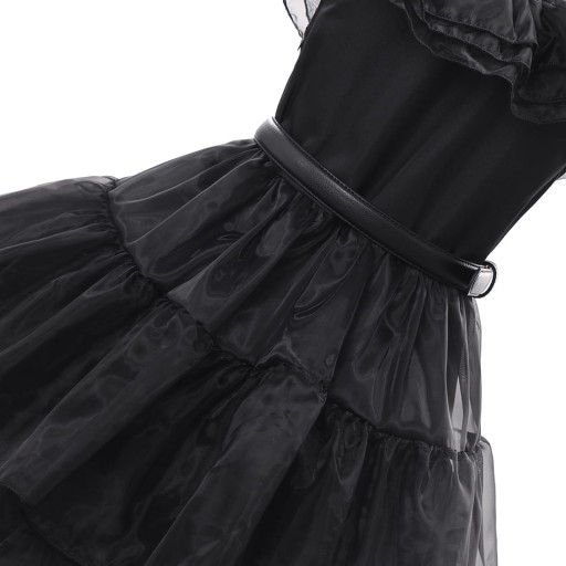 Fantastyczny strój odwzorowany na podobieństwo kultowej postaci Wednesday Addams.