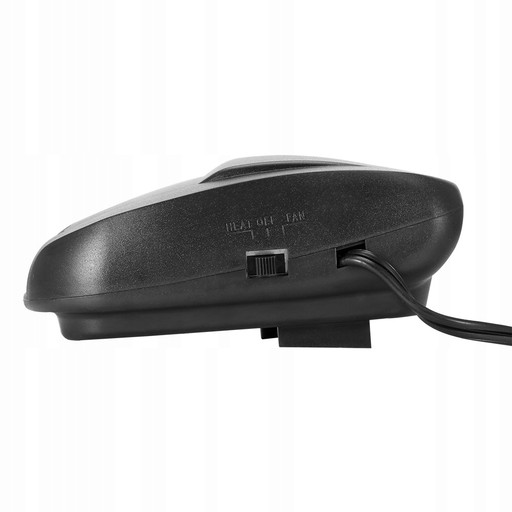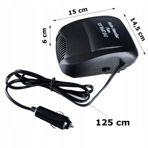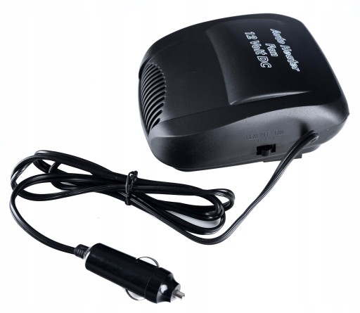 Termowentylator samochodowy zasilany z gniazda zapalniczki 12V. Posiada 2 tryby pracy: grzanie oraz wentylator.