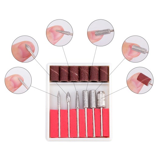 Komplet 5 frezów diamentowych z nośnikiem. Frezy z nasypem idealnie nadają się do spiłowywania masy akrylowej czy żelowej, usuwania skórek jak również do zabiegu pedicure.