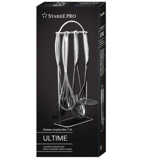 Zestaw przyborów kuchennych Starke Pro Ultime 7 elementów (szumówka, łopatka, tłuczek do ziemniaków, trzepaczka, łyżka i nabierka) usprawnią gotowanie, smażenie, przyrządzanie i podawanie potraw. Dzięki stojakowi będą zawsze pod ręką i w jednym miejscu. Wykonanie ze stali nierdzewnej sprawia, że zyskujesz trwałą i bezpieczną dla zdrowia pomoc w kuchni.