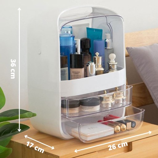 Podwójne drzwi gablotki oraz szuflady zapewniają ochronę Twoich kosmetyków przed kurzem i wilgocią. Dzięki przezroczystym pokrywom kosmetyki są ładnie wyeksponowane, a Ty nie musisz się martwić, że przykryje je kurz.