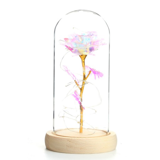 Kolorowa, przezroczysta, opalizująca sztuczna róża ze złotą łodygą w kopule szklanej, ze stałym kolorowym oświetleniem LED, na jasnej drewnianej podstawce z pudełkiem prezentowym z okienkiem.