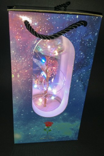 Ta precyzyjnie zrobiona róża, symbol miłości, została umieszczona w szklanej, pięknej kopule, przez którą widać cały czas jej piękno, nawet po ciemku, gdyż rozświetla ją 20 światełek LED o kilku kolorach, którymi jest oplatana.