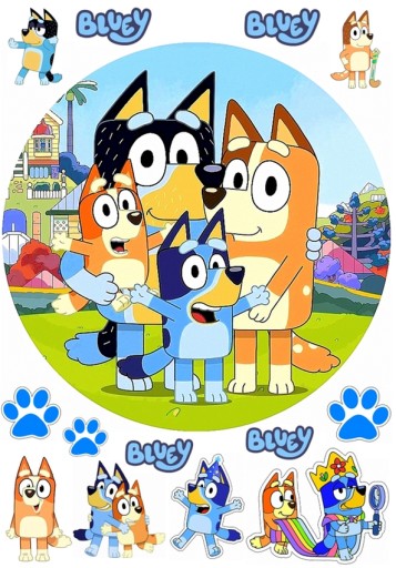 Gruby jadalny okrągły opłatek na tort z wafla z motywem BLUEY.