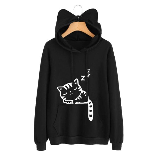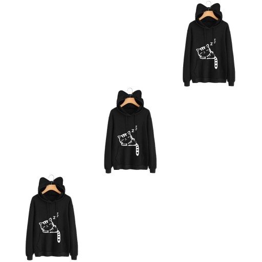 3 x Moda Damska Przednia Kieszeń Bluza Z Kapturem Kot Uszy Śpiący Kot Wzór Drukowany Sweter Bluza Rozmiar L (Czarny)