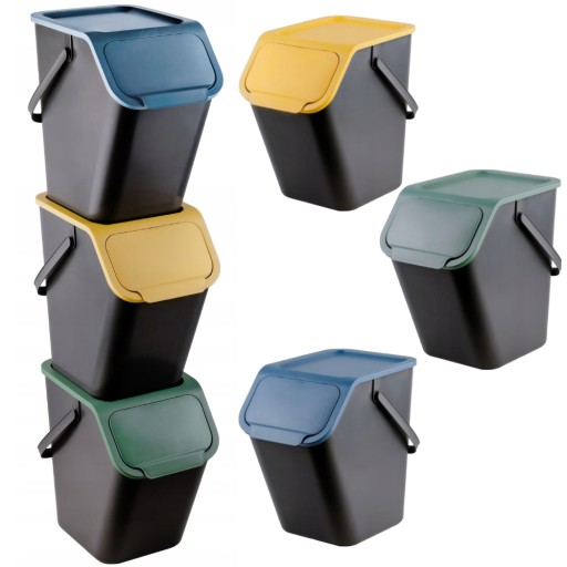 Każdy pojemnik to kolor odpowiadający rodzajowi odpadów: niebieski - papier, żółty - plastik, zielony - szkło. Pokrywa uchylająca się pod skosem umożliwia układanie do trzech pojemników jeden na drugim.