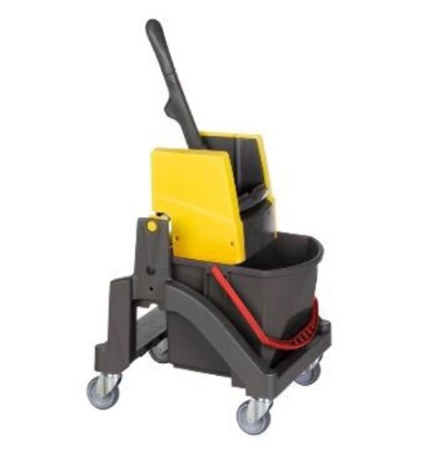 Wózek składa się Podstawy 1x17l i czterech kółek, 1 wiadra 17l oraz prasy pionowej do mopów VK 4 z rączką. W wyciskace umieszczona jest dodatkowo wkładka kauczukowa, która ma za zadanie lepiej odciskać mopa