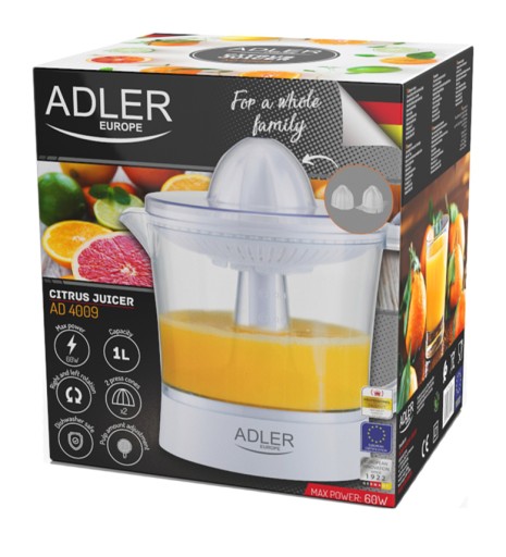 Wyciskarka AD 4009 posiada 2 stożki wyciskające, odpowiednie dla owoców o różnej średnicy. Pojemność 1l daje możliwość przygotowania soku dla całej rodziny.Chowany przewód zasilający w obudowie.