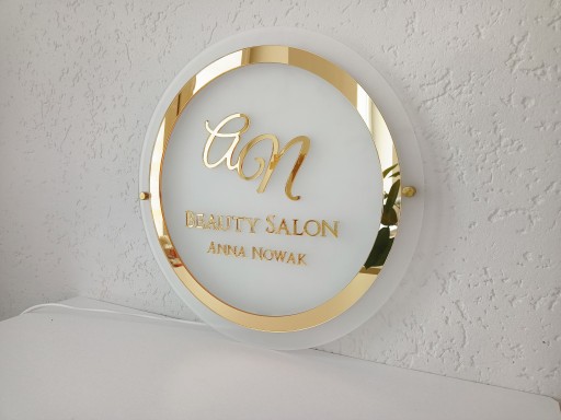 Szyld wykonany jest z podkładu pleksi szronionej (półprzezroczysta), a napisy i logo jako kolorowy lub lustrzany (złoty, srebrny, rosegold) akryl.