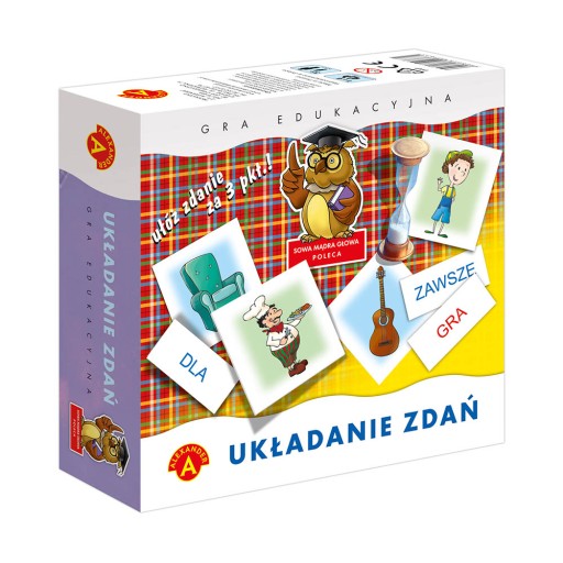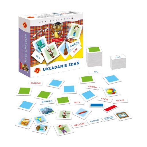 Gra dydaktyczna "Układanie zdań" polega na układaniu kartoników z obrazkami i napisami (częściami mowy) w taki sposób, aby powstało logiczne i poprawne gramatycznie zdanie. Gra wprowadza dzieci w świat gramatyki, uczy logicznego myślenia, kształtuje słuch fonemowy, doskonali umiejętności wypowiadania się i uruchamia dziecięcą wyobraźnię.