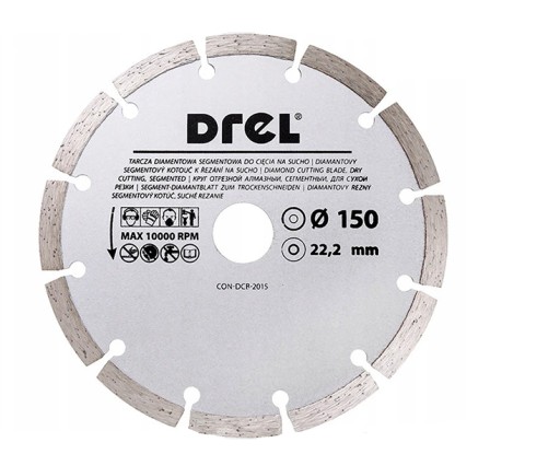 Diamentowa tarcza segmentowa ze szczelinami do cięcia na sucho materiałów budowlanych marki Drel, o wymiarach 150x22.2 mm.