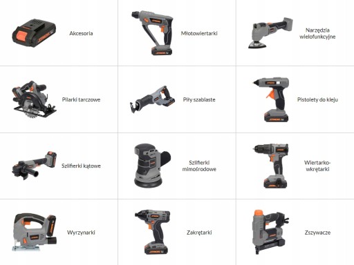 Piła jest zasilana akumulatorem 20V obsługującym całą paletę urządzeń, np. szlifierkę kątową 125mm 78090, pilarkę tarczową 78133 oraz wiele innych urządzeń.