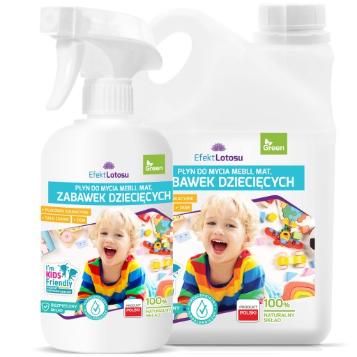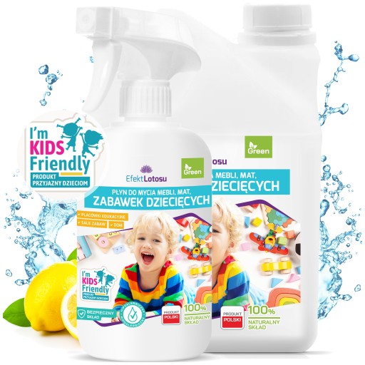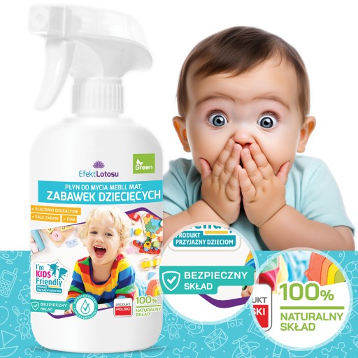 Naturalny płyn EfektLotosu o delikatnym zapachu cytryny i mięty do mycia zabawek, mat, mebli dziecięcych i innych powierzchni, z którymi dziecko ma styczność. Składa się w 100% z naturalnych składników, przez co jest bezpieczny dla małego dziecka. Dziecko może dotykać czyszczonej powierzchni bezpośrednio po myciu.