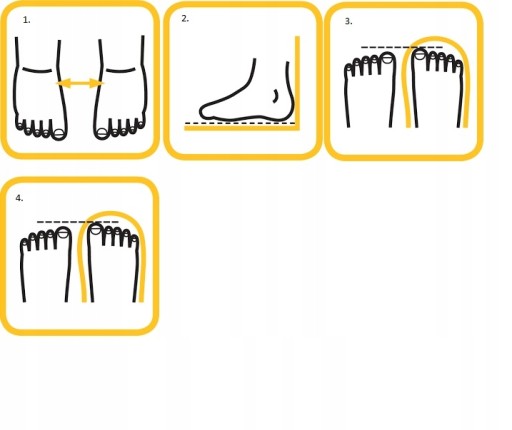 4. Należy zmierzyć obie stopy, ponieważ często jedna jest dłuższa od drugiej, obuwie należy dobrać do dłuższej stopy