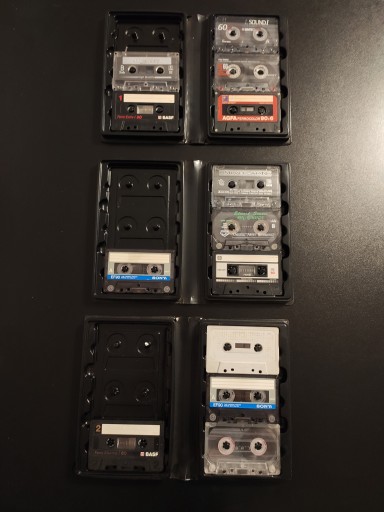 posiadam na sprzedaż zestaw kaset magnetofonowych. Stan wizualny widoczny na zdjęciach powyżej. Sprzedaje wszystko co widoczne na zdjęciach (13 kaset magnetofonowych), wraz z trzema pokrowcami na kasety. Na kasetach być może jest coś nagrane, niestety nie zostały sprawdzone wszystkie pod kątem treści nagrań.