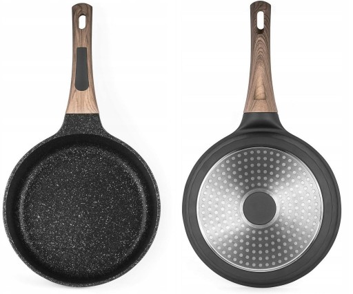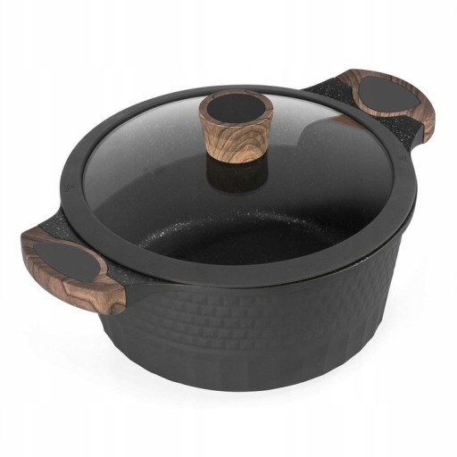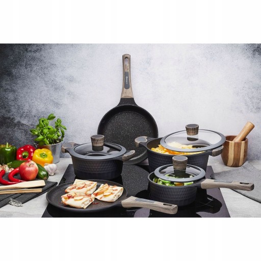 Pozostałe informacje: - garnki i patelnie wykonane z aluminium, odlewane, - pokryte powłoką Greblon C3+ z drobinkami granitu, - powłoka trójwarstwowa, - 20000 cykli ścierania, - grubość powłoki: 40- 45 um, - PFOA free, - uchwyty z tworzywa typu soft touch z silikonowym wykończeniem, przykręcane, - pokrywy szklane z silikonowym rantem, - odpowietrzniki w rancie pokrywy, - grubość brzegu: 6,5 mm, - grubość dna: 5 mm, - grubość ścianki: 1,4-2 mm, - 5 lat gwarancji