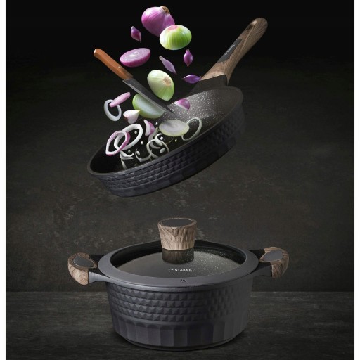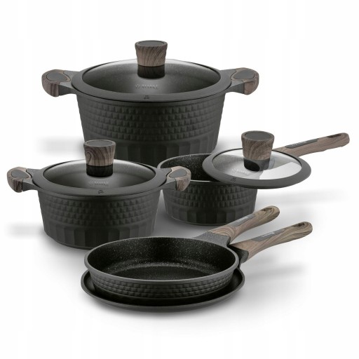 Zestaw garnków marmurowych na indukcję Starke Pro Embossed 8 elementów wykonany jest z aluminium. Do jego stworzenia wykorzystano technikę jednorodnego odlewu die cast.