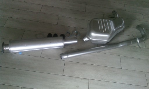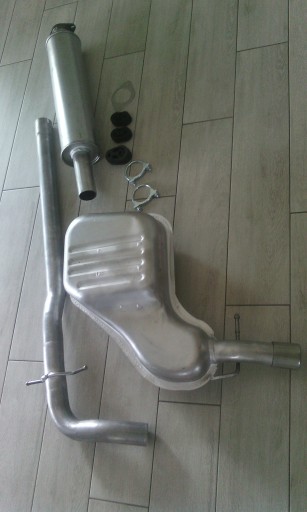 TŁUMIK KOŃCOWY POSIADA POLEROWANĄ KOŃCÓWKĘ SKIEROWANĄ DO DOŁU. TŁUMIK ŚRODKOWY SKŁADA SIĘ Z 2 CZĘŚCI TAK JAK NA ZDJĘCIU ( W KOMPLECIE OBEJMA MONTAŻOWA DO POŁĄCZENIA).