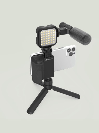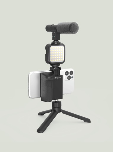 Uniwersalny mikrofon, który działa na każdym smartfonie lub aparacie, lampa, która posiada 36 super jasnych diod LED oraz statyw stołowy z uniwersalnym mocowaniem, które świetnie sprawdzi się w każdym aparacie (lustrzankach cyfrowych, aparatach bezlusterkowych, kamerach sportowych).