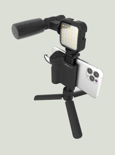 Zestaw Follow Me Vlogging Kit posiada uchwyt na smartfona z gładkim gumowym wykończeniem dla lepszej obsługi oraz wbudowany bezprzewodowy pilot, który działa w odległości do 9 metrów.