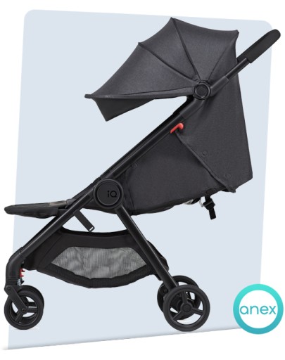 IQ dzięki najnowszej technologii można zwęzić do wymiarów małego wózka, który osiąga wymiary bagażu podręcznego. Dzięki zastosowaniu najwyższej klasy systemu zawieszenia, który jest zintegrowany z mechanizmem składania, jest to jeden z najdelikatniejszych wózków na rynku.