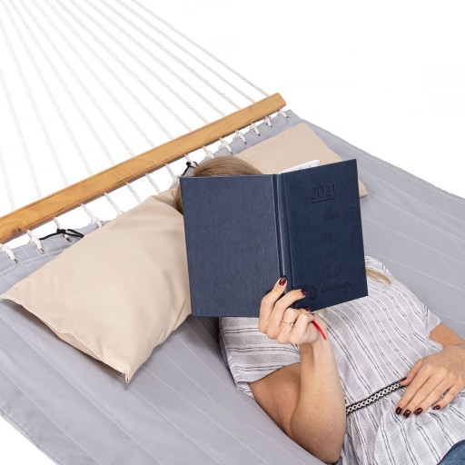 Hamak posiada z dwóch stron pętle do zamocowania w dowolnym miejscu i długie drewniane belki na całej szerokości, które zapobiegają plątaniu się sznurów i gwarantują wygodny wypoczynek zarówno jednej, jak i kilku osobom, niezależnie od pozycji. Po złożeniu zajmuje niewiele miejsca, co sprawia że zabranie go ze sobą nie sprawi Ci żadnego problemu.