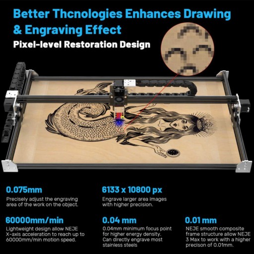 - Maksymalna głębokość cięcia i grawerowania: ok. 18 mm / 0,7 cala (Dane są testowane przez użytkowników, należy je wspomóc dokładniejszym ustawianiem ostrości i dodawaniem prawidłowego i pewnego natężenia powietrza.)