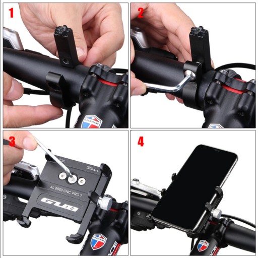 Solidny uchwyt wykonany w całości z aluminium, mocowany zaciskiem do kierownicy lub mostka. Wszystko łączone na śruby, co daje gwarancję stabilności nawet w trudnych warunkach jazdy. Możliwość montażu w pionie jak i w poziomie. Dopasowany do telefonów o szerokości od 55 do 100 mm.