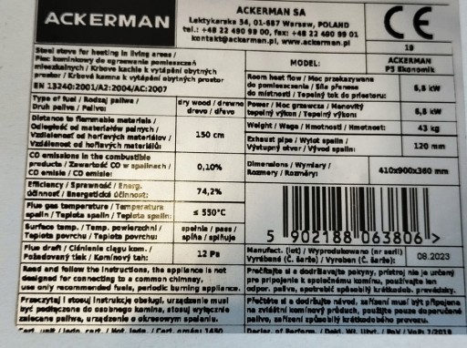 14. Naklejka znamionowa umieszczona na tylnej ścianie pieca to identyfikator produktu oraz potwierdzenie spełniania przez niego podawanych parametrów. Zawarte na niej informacje potwierdzają że urządzenie spełnia bardzo rygorystyczne wymagania Ekoprojektu.