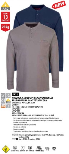- Bardzo wygodna koszulka, trudnopalna i antystatyczna, z normą NFPA2112 i całodziennym komfortem pracy.