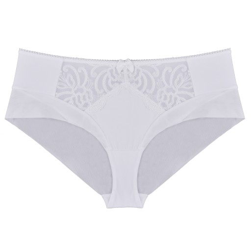 Efektowne majteczki, nieco zabudowane na nogawkach. Przód został wykonany z gładkiej dzianiny, której lekkości dodają haftowane wstawki. Model pięknie podkreśla pośladki.