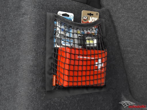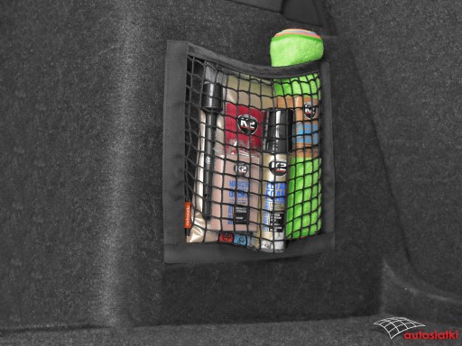 To wytrzymała siatka obszyta od dołu i po bokach taśmą typu rzep. Od góry wykończona gumą, która zabezpiecza i chroni akcesoria przed przemieszczaniem. Kieszeń mocuje się do wykładziny w bagażniku lub kabinie auta.