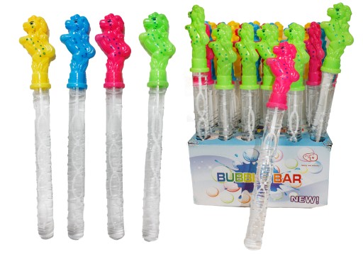 Zanurzamy rączkę w płynie i energicznym ruchem przesuwamy mieczykiem wokół własnej osi, pod naciskiem powietrza wyskakuje mnóstwo kolorowych baniek tworząc bajkową stylizację do zdjęć i ciekawej zabawy