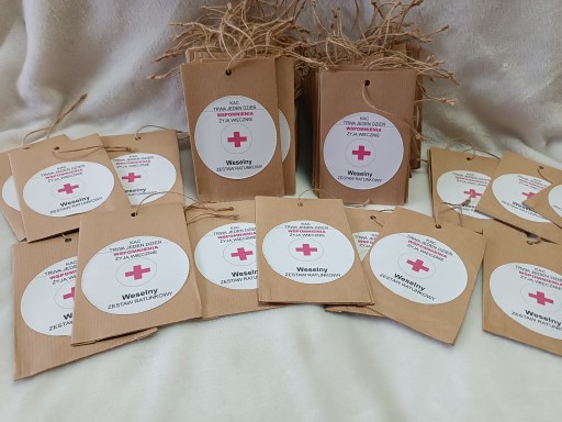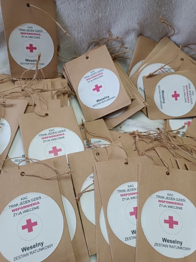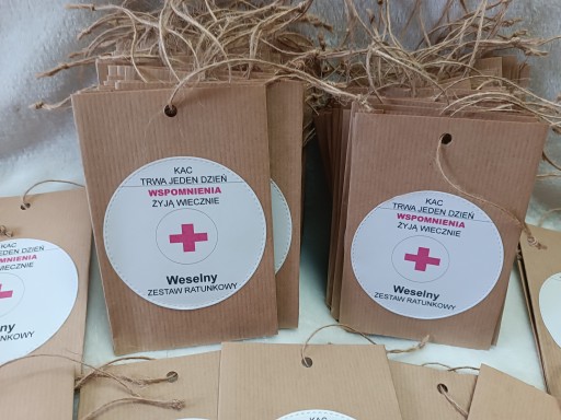 Weselny zestaw ratunkowy pierwszej pomocy dla gości weselnych w formie torebki z szarego papieru. Idealny na aspirynę, elektrolity czy środek na kaca, całość można zawiesić na buteleczce wody i rozdawać gościom na pożegnanie