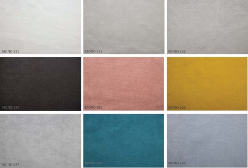 Tkanina delikatna, miękka w dotyku, welwetowa o matowej strukturze. Tkanina łatwa w utrzymaniu czystości, ogranicza wchłanianie płynów, nadaje się zarówno dla rodzin z dziećmi oraz dla rodzin ze zwierzętami.