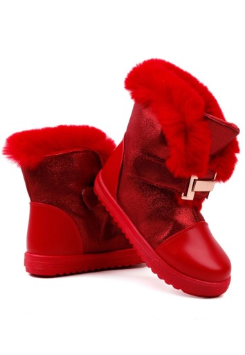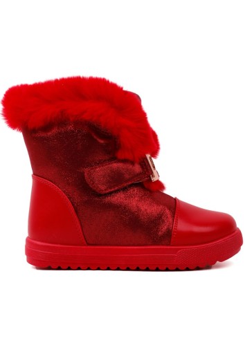 Botki -śniegowce dziewczęce,osadzone na płaskiej podeszwie. Cholewka sięga do łydki. Wykonane z ekoskóry w połaczeniu z materiałem. Z przodu zapinane na rzep z ozdobna klamrą. Górna część cholewki oraz język zdobia wstawki z miękkiego futerka. Model ocieplony. Urocze i komfortowe botki ,z pewnością odnają się w dziecięcej garderobie.