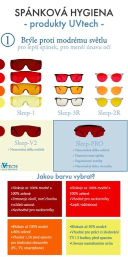 Okulary SLEEP-1 z pomarańczowym widmem światła niebieskiego i zielonego przeznaczone są do noszenia na 1-3 godziny przed snem w celu wytłumienia niebieskiej i częściowo zielonej składowej widma, co powoduje spadek produkcji melatoniny u ludzi w godzinach wieczornych. Nadaje się do pracy na komputerze lub oglądania telewizji.