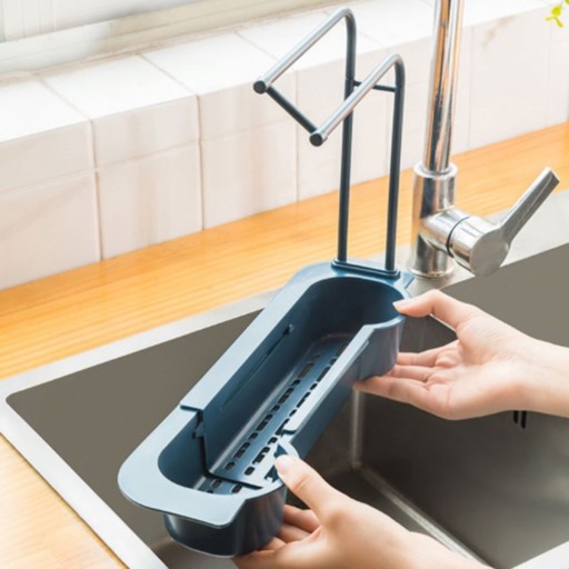 Funkcjonalny, rozkładany organizer kuchenny do zlewu. Znacznie ułatwia utrzymanie porządku w kuchni. Świetnie sprawdzi się jako pojemnik na gąbki, szczotki i druciaki. Dziurkowane dno umożliwia bieżące odprowadzanie wody. Wyposażony w dodatkowy wieszak służący do zawieszenia ręczników i ścierek. Rozkładana konstrukcja umożliwia wygodny montaż na krawędziach zlewozmywaka.